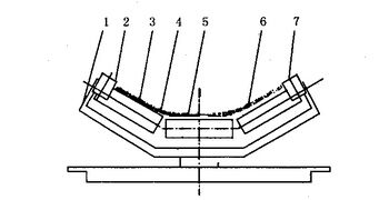 1-旋轉架 2-左曲線盤和左托輥 3-輸送帶 4-中托輥 5-右曲線盤和右托輥