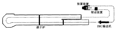 本文中IMC輸送機與U型烘干爐配合使用。IMC輸送機的驅(qū)動裝置和張緊裝置均布置在U型烘干爐室體外面,僅有軌道和鏈條位于烘干爐室體內(nèi)部,而這兩部分基本不會發(fā)生故障,因此該設備的維修就顯得極為方便。同時烘干爐設計為橋式結構,烘爐的進、出口分別設置成上、下坡,使IMC輸送機在整個輸送回路上存在1個爬坡段和1個下坡段,這樣整條鏈條在上、下坡段的運行阻力和鏈條張緊力之間具有相互均衡的效果,避免輸送電機出現(xiàn)過載報警,從而確保U型烘干爐與IMC輸送機獲得很好的配合使用效果。另外,輸送機可選用氣動張緊方式,氣缸通過定滑輪將鋼絲繩的拉力傳遞至伸縮框架,然后帶動預先設置在軌道上的伸縮軌道(圖2中張緊裝置處彎軌)調(diào)整鏈條的張緊程度,這樣便可以很好地抵消因烘干爐內(nèi)部高溫造成輸送機受熱或降溫而引起的軌道和鏈條的伸縮量。